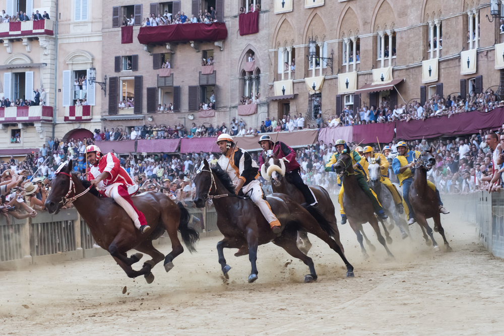 Una delle più celebri manifestazioni italiane. Dieci contrade della città si sfidano in una corsa a cavallo attorno a Piazza del Campo, in un clima di fortissima partecipazione popolare e orgoglio identitario. Il Palio non è solo la corsa, ma una serie di rituali e celebrazioni che coinvolgono tutta la città anche nei giorni e nelle settimane precedenti alla corsa.